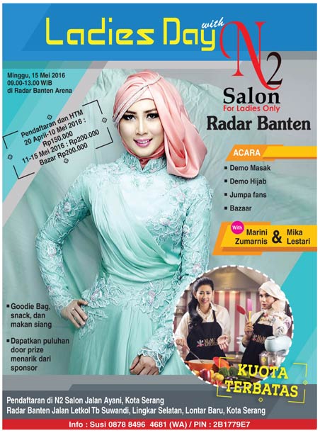 SERANG – N2 Salon dan Radar Banten bakal menggelar acara Ladies Day 2016 yang akan berlangsung di Radar Banten Arena, Graha Pena, Minggu (15/5/2016) mendatang. Ladies Day 2016 ini bakal diisi beragam acara menarik seperti demo masak, tutorial hijab, makeup, jumpa fans, dan bazar.