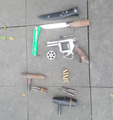 Barang bukti yang diamankan satu bilah pisau beserta sarungnya, dua buah kunci letter T, enam mata kunci letter T, satu pucuk senjata api rakitan berikut lima peluru, satu pisau cutter, satu unit sepeda motor Honda Beat warna putih merah nopol BE-4771-AO, satu unit sepeda motor Honda Vario warna merah hitam B-3370-CBX. (Bayu Mulyana/coffeandchococake@gmail.com)