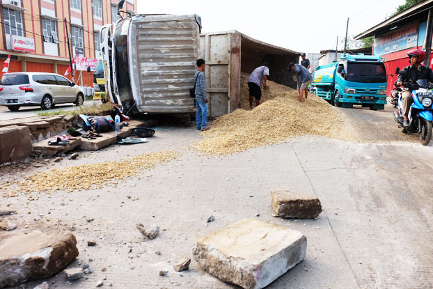Sebelumnya, sebuah truk kontainer terbalik di Jalan Raya Serang-Cilegon, Desa Serdang, Kecamatan Kramatwatu, Kabupaten Serang, pada Jumat (18/8). Badan truk menutupi badan jalan setelah menghantam median jalan sekira pukul 05.30 WIB.