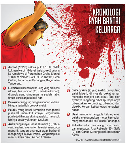 Dari info yang berhasil dihimpun, peristiwa tersebut bermula dari cekcok mulut antara pelaku (Lukman-red) dan istrinya Ana Robinah (35), Jumat (13/10) sekira pukul 18.00 WIB. Ribut keduanya kerap dipicu persoalan ekonomi. Rupanya, peristiwa ribut mulut malam itu, adalah puncaknya yang berakhir dengan tewasnya istri pelaku (Ana-red), dua putri kandungnya yakni Syifa Syakila (9) dan Carisa Humaira (3). Ketiganya meregang nyawa di tangan Lukman. (Selengkapnya lihat info grafis-red).