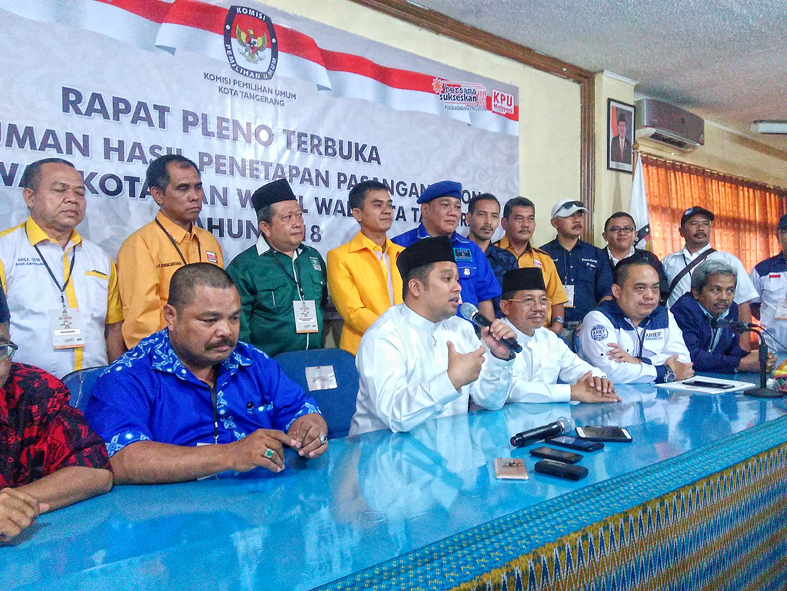 “Komisi Pemilihan Umum Kota Tangerang menetapkan satu pasangan calon, yaitu Arief R Wismansyah dan Sachrudin,” ujar komisioner KPU Kota Tangerang Banani Bahrul saat membacakan surat penetapan paslon, Senin (12/2).