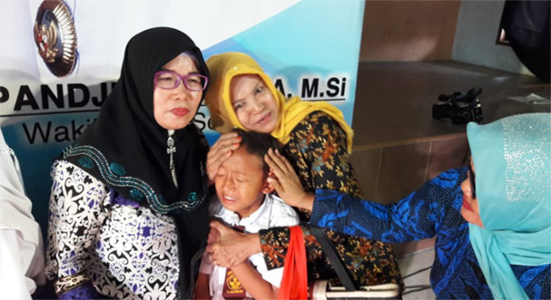 Kepala sekolah dan guru menenangkan Pasha yang menangis haru karena lolos menjadi finalis.