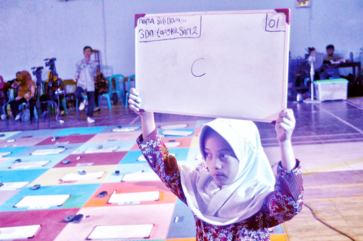 Siti Noviani dari SDN Tangkilsari 2 menujukkan jawaban