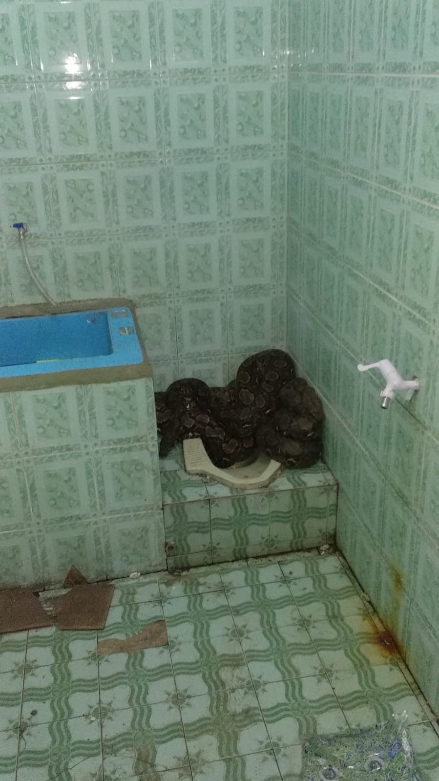“Awalnya istrinya saya ingin mengambil seragam, namun ketika masuk kondisi rumah sudah berantakan, dia langsung bergegas mengecek setiap ruangan ditakutkan adanya maling, pada saat mengecek kamar mandi, istrinya dikagetkan oleh ular besar diatas closet,” katanya.