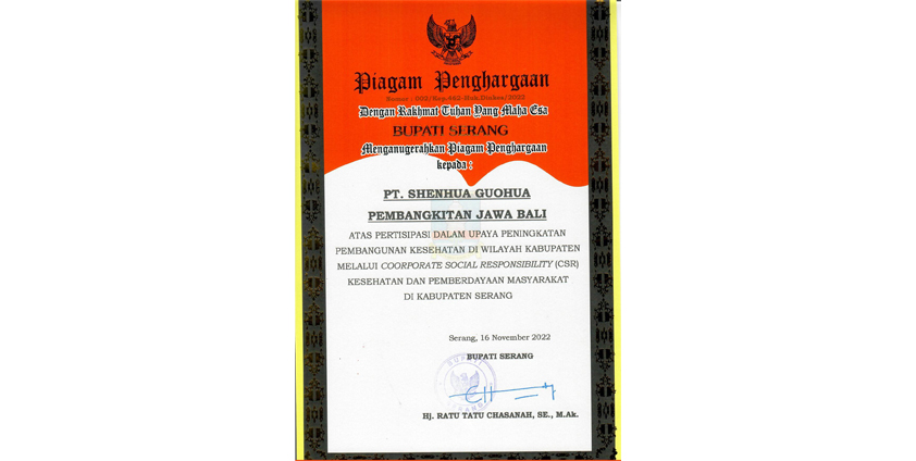 SERANG – Bupati Serang memberikan penghargaan kepada PT Shenhua Guohua Pembangkitan Jawa Bali (PT SGPJB), sebagai pemilik PLTU Jawa 7, atas inisiatif program Corporate Social Responsibility (CSR) bidang kesehatan.