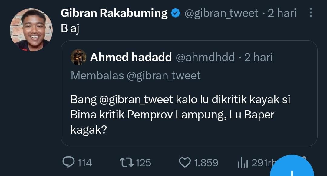 Bersambung dengan cuitan netizen di atas, “Bang @gibran_tweet kalo lu dikritik kayak si Bima kritik Pemprov Lampung, Lu Baper kagak?” balasan Gibran “B aj” seolah membuat interaksinya VS netizen menjadi lucu sekaligus menohok.