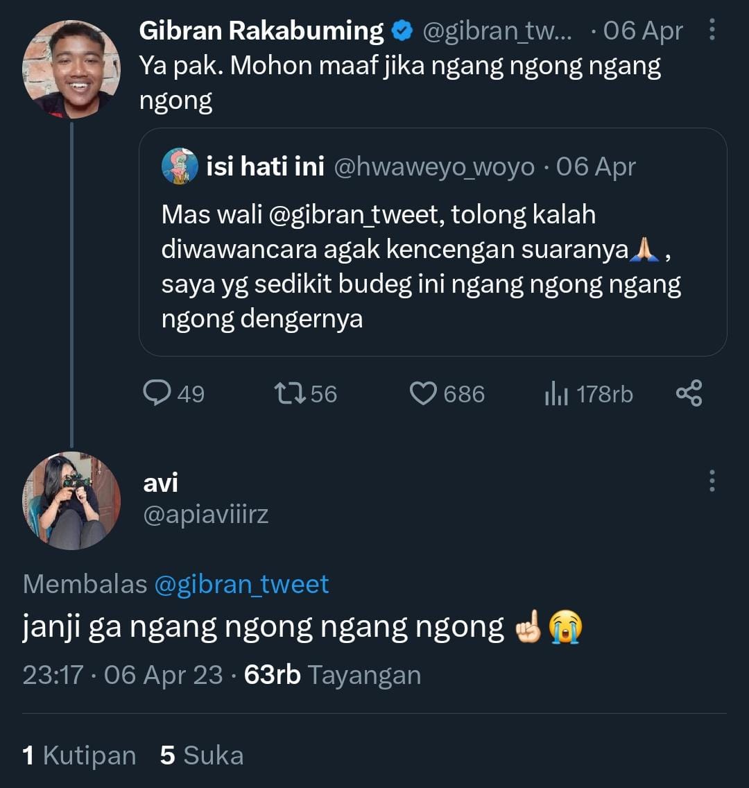 Tidak sampai disitu, Wali Kota Gibran juga membalas “Ya pak. Mohon maaf jika ngang ngong ngang ngong” pada komentar netizen @hwaweyo_woyo “Mas wali, tolong kalau diwawancara agak kencengan suaranya, saya yg sedikit budeg ini ngang ngong ngang ngong dengernya”.