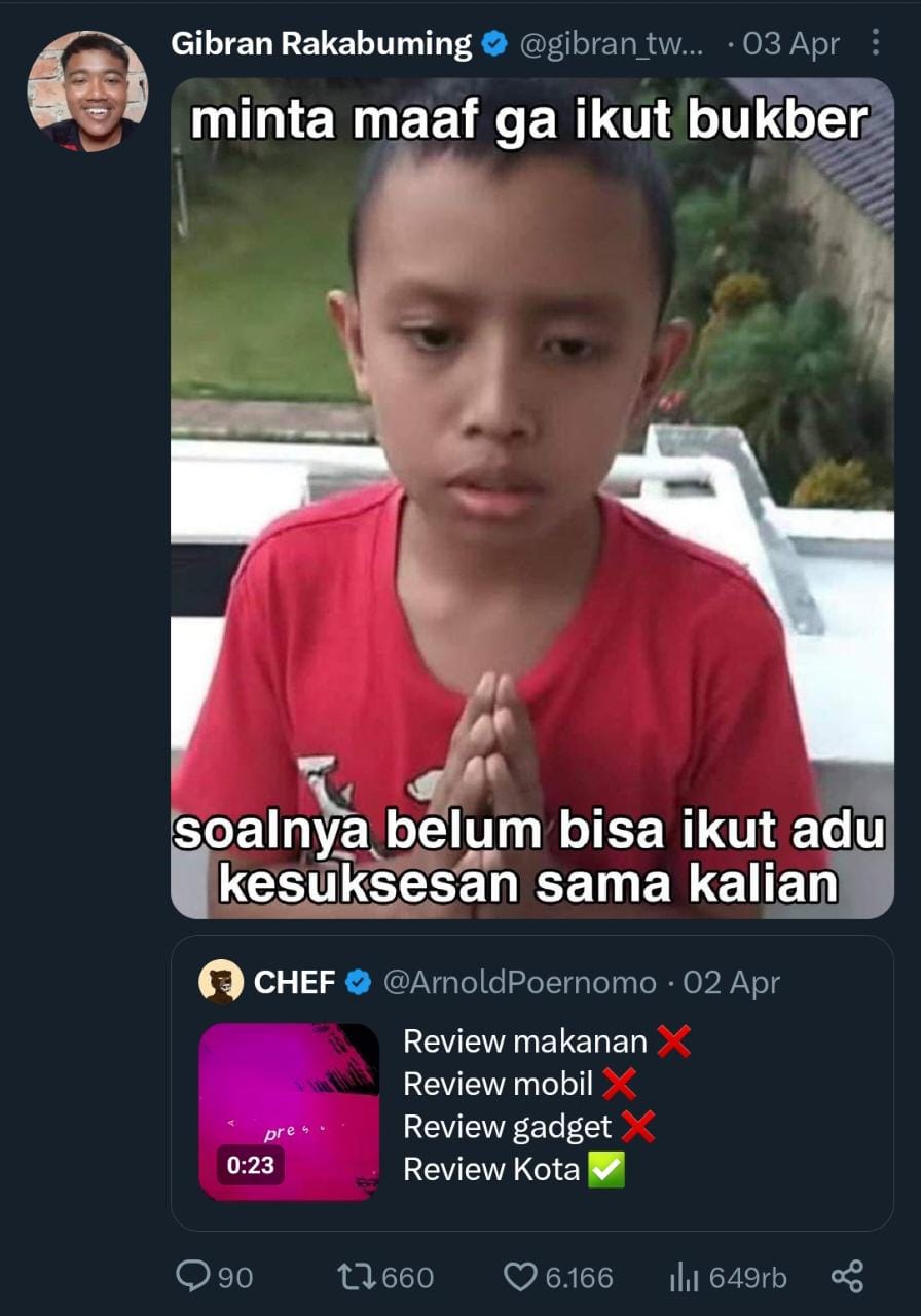 “Review makanan, No. Review Mobil, NO. Review Gadget, No. Review Kota, YES.” Cuitan itu dibalasnya menggunakan meme dengan gambar anak kecil “minta maaf gak ikut bukber, soalnya belum bisa ikut adu kesuksesan sama kalian”.