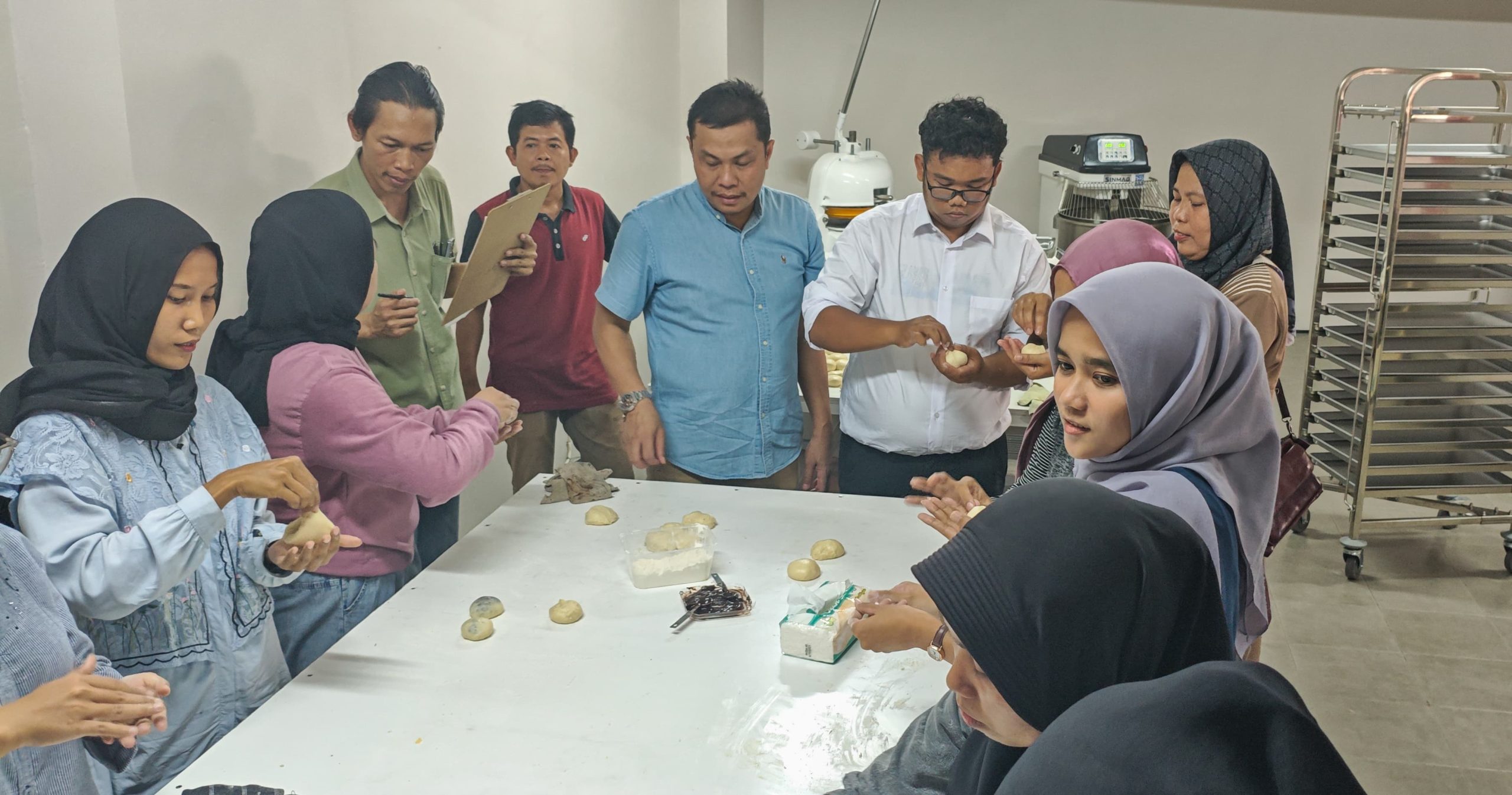 Penulis bersama sejumlah keluarga karyawan Radar Banten yang tergabung dalam Kelompok Usaha Bersama (KUB) Sejahtera Bersama terlibat langsung dalam pembuatan roti.